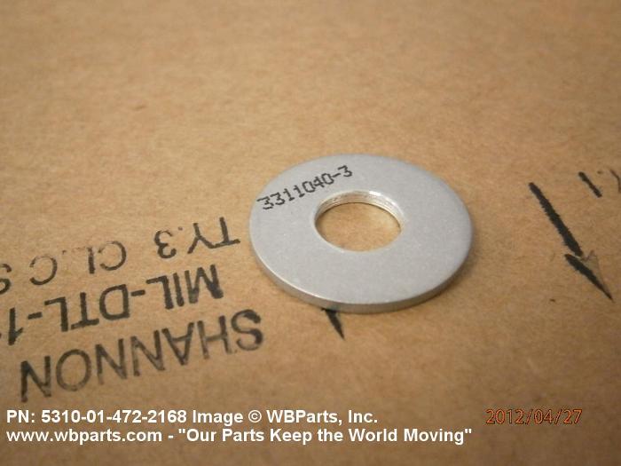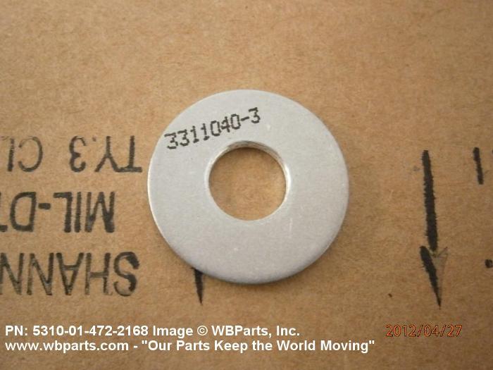 5310-01-472-2168 A washer having a centrally located hole with a solid or laminated cross-section and two flat parallel bearing surfaces. The hole must be 75 percent or less than the largest dimension and the bearing surface finish is greater than 32 microinch (0.8 micrometer). The thickness cannot exceed 25 percent of the largest outside dimension. When the largest outside dimension is less than 1/4 inch or 6mm, the thickness must be 0.006 inches (0.15mm) or greater and for items 1/4 inch (6mm) or larger, the thickness must be 0.016 inches (0.4mm) or greater. The maximum tolerance is applied to dimensions and used as a determining factor. Items with separable lamination use SHIM. For items fabricated from ceramic or electrically rated materials by specification or industry standards use INSULATOR (1), WASHER. Excludes DISK, VALVE, graphite impregnated and lubricated items.