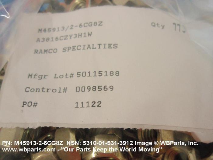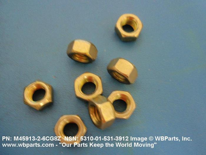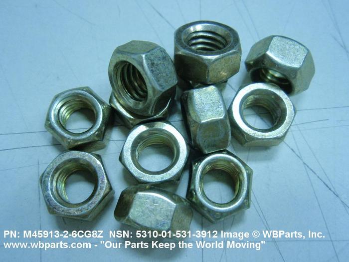 5310-01-531-3912 A nut having a flat bottom and 6 sides. An integral feature is incorporated for locking on the threads of a mating member. Excludes NUT (1), SELF-LOCKING, CAP.