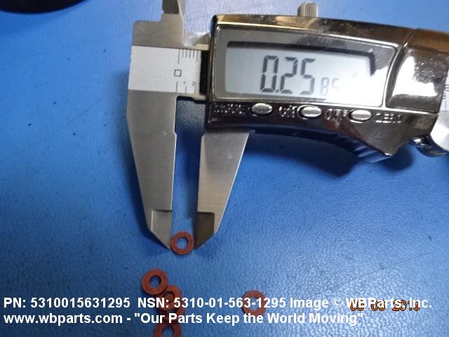 5310-01-563-1295 A washer having a centrally located hole with a solid or laminated cross-section and two flat parallel bearing surfaces. The hole must be 75 percent or less than the largest dimension and the bearing surface finish is greater than 32 microinch (0.8 micrometer). The thickness cannot exceed 25 percent of the largest outside dimension. When the largest outside dimension is less than 1/4 inch or 6mm, the thickness must be 0.006 inches (0.15mm) or greater and for items 1/4 inch (6mm) or larger, the thickness must be 0.016 inches (0.4mm) or greater. The maximum tolerance is applied to dimensions and used as a determining factor. Items with separable lamination use SHIM. For items fabricated from ceramic or electrically rated materials by specification or industry standards use INSULATOR (1), WASHER. Excludes DISK, VALVE, graphite impregnated and lubricated items.