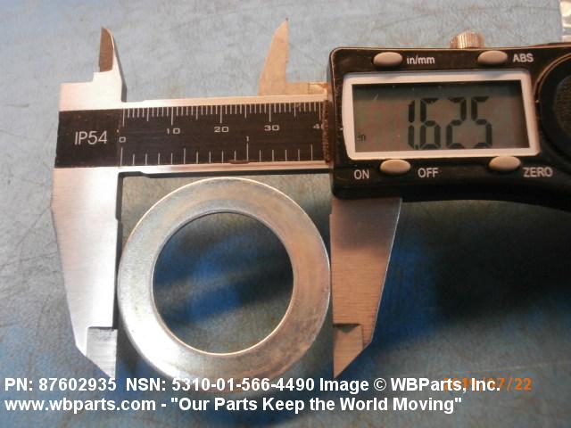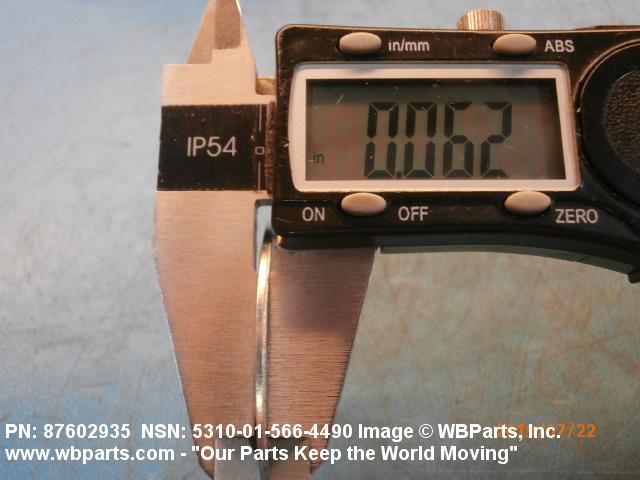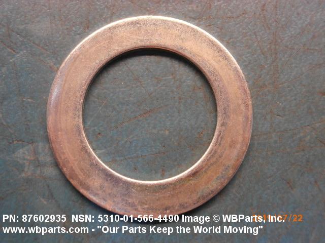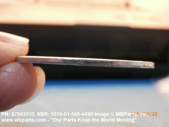 5310-01-566-4490 A washer having a centrally located hole with a solid or laminated cross-section and two flat parallel bearing surfaces. The hole must be 75 percent or less than the largest dimension and the bearing surface finish is greater than 32 microinch (0.8 micrometer). The thickness cannot exceed 25 percent of the largest outside dimension. When the largest outside dimension is less than 1/4 inch or 6mm, the thickness must be 0.006 inches (0.15mm) or greater and for items 1/4 inch (6mm) or larger, the thickness must be 0.016 inches (0.4mm) or greater. The maximum tolerance is applied to dimensions and used as a determining factor. Items with separable lamination use SHIM. For items fabricated from ceramic or electrically rated materials by specification or industry standards use INSULATOR (1), WASHER. Excludes DISK, VALVE, graphite impregnated and lubricated items.