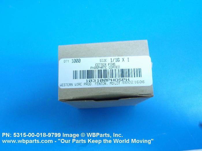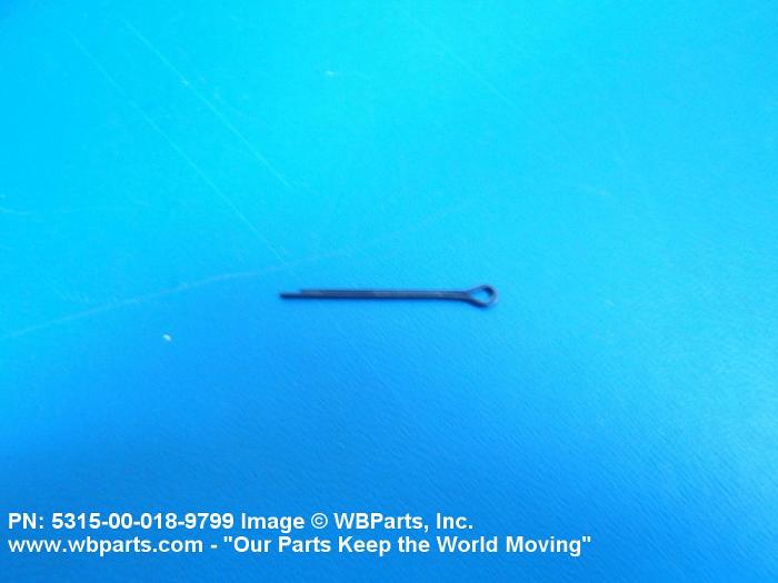 5315-00-018-9799 A half round, cylindrical, or flat piece of metal, bent to form a straight or crimped two-pronged device with an eye at one end, for inserting in a hole drilled at right angle to the axis of the stud, shaft, or like item. Its ends are separable or one end is bent to hold it in place.
