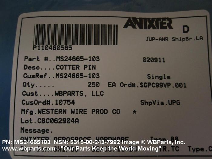 | MS24665-103 | 80205 | NATIONAL AEROSPACE STANDARDS COMMITTEE AEROSPACE INDUSTRIES |