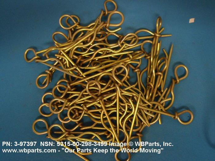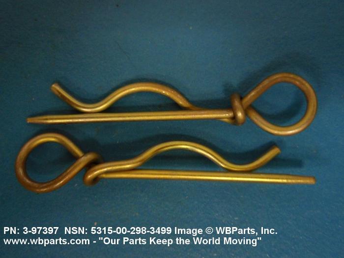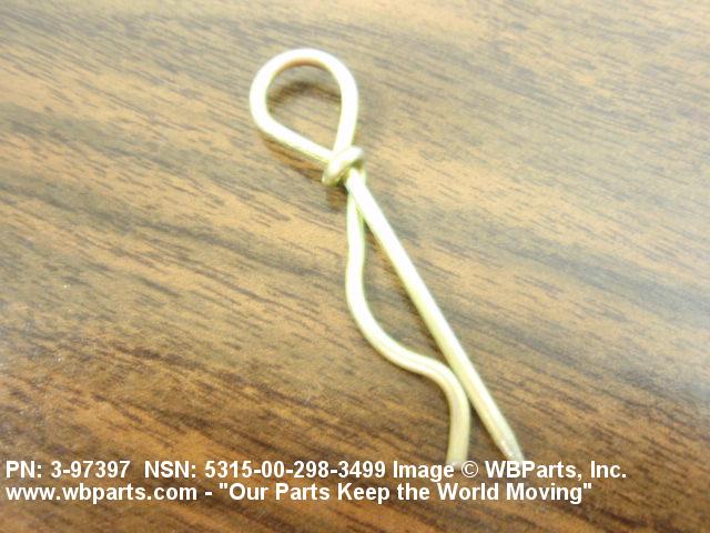 5315-00-298-3499 A fastening device formed from resilient wire stock into a shape resembling the letter "U", of which at least one of the prongs is straight for insertion into a hole; the other prong may have one or more curvatures along its length. It is designed to hold itself in place by its inherent spring action. See also CLIP, RETAINING and RING, RETAINING.