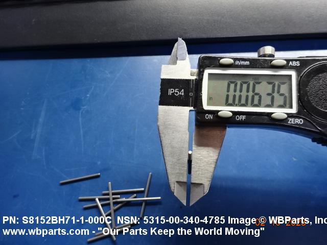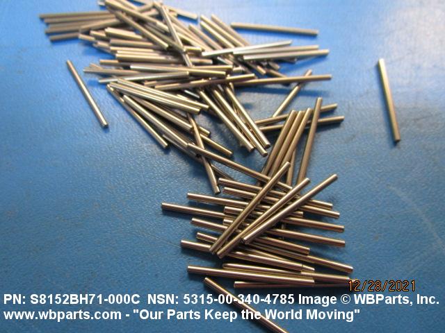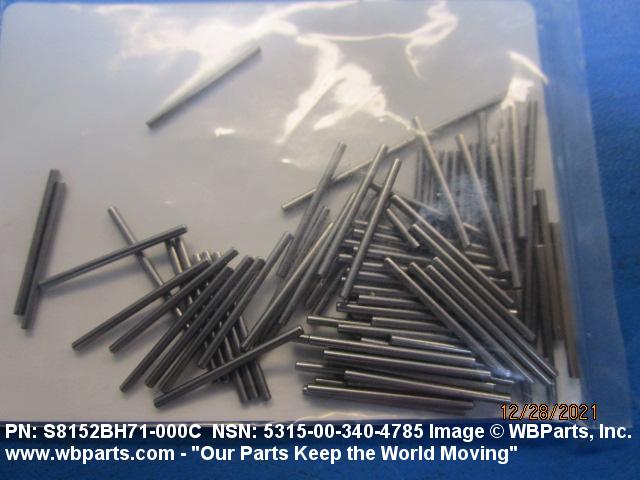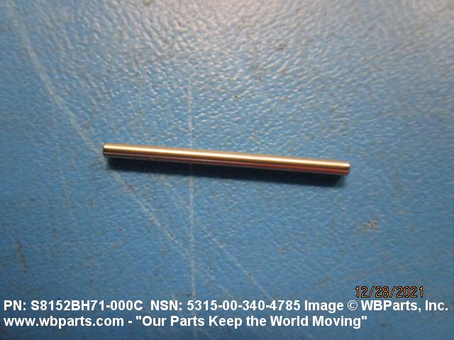 5315-00-340-4785 A headless, cylindrically-shaped item having a straight, smooth, solid body, with or without a drilled hole(s). It has an outside diameter equal to or less than its length. Its length must not exceed twelve inches (304 MM); for items whose length exceeds twelve inches (304 MM); see ROD, STRAIGHT, HEADLESS. It is used for aligning or transfer of torque and/or thrust, by fitting into corresponding holes of another item. See also PIN, STRAIGHT, THREADED.