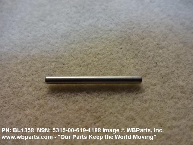 5315-00-619-4188 A headless, cylindrically-shaped item having a straight, smooth, solid body, with or without a drilled hole(s). It has an outside diameter equal to or less than its length. Its length must not exceed twelve inches (304 MM); for items whose length exceeds twelve inches (304 MM); see ROD, STRAIGHT, HEADLESS. It is used for aligning or transfer of torque and/or thrust, by fitting into corresponding holes of another item. See also PIN, STRAIGHT, THREADED.