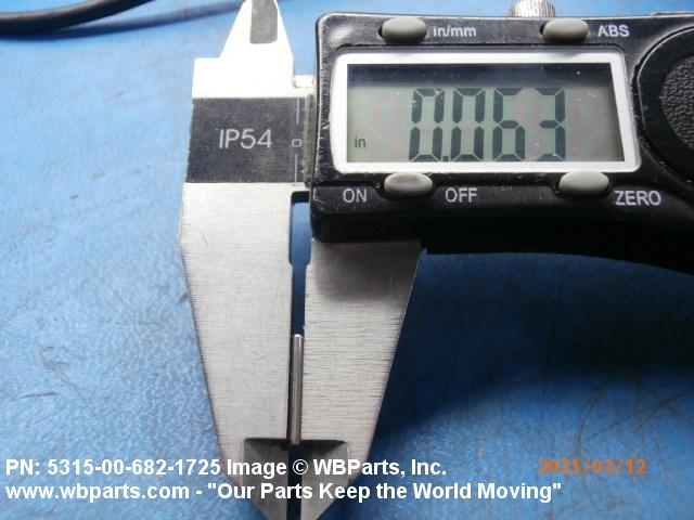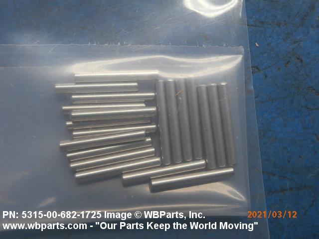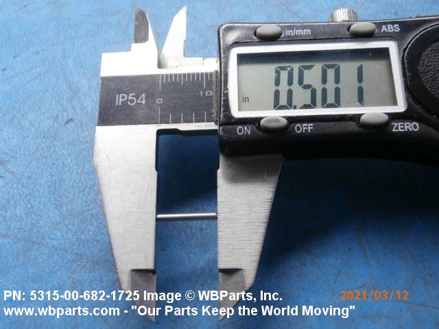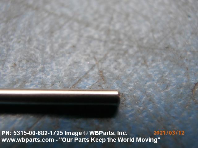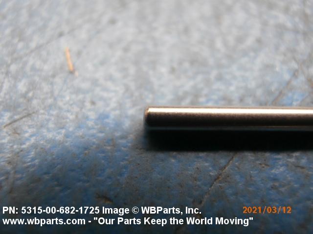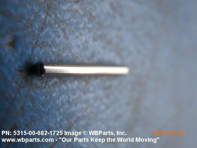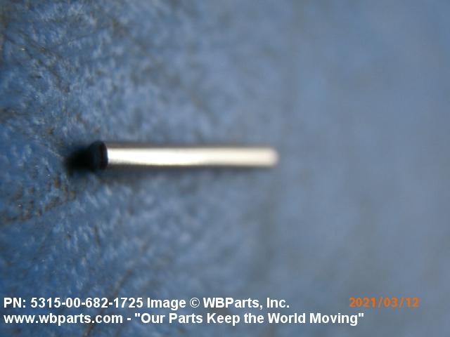 5315-00-682-1725 A headless, cylindrically-shaped item having a straight, smooth, solid body, with or without a drilled hole(s). It has an outside diameter equal to or less than its length. Its length must not exceed twelve inches (304 MM); for items whose length exceeds twelve inches (304 MM); see ROD, STRAIGHT, HEADLESS. It is used for aligning or transfer of torque and/or thrust, by fitting into corresponding holes of another item. See also PIN, STRAIGHT, THREADED.