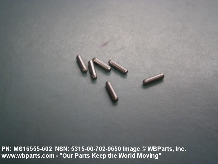 5315-00-702-9650 A headless, cylindrically-shaped item having a straight, smooth, solid body, with or without a drilled hole(s). It has an outside diameter equal to or less than its length. Its length must not exceed twelve inches (304 MM); for items whose length exceeds twelve inches (304 MM); see ROD, STRAIGHT, HEADLESS. It is used for aligning or transfer of torque and/or thrust, by fitting into corresponding holes of another item. See also PIN, STRAIGHT, THREADED.