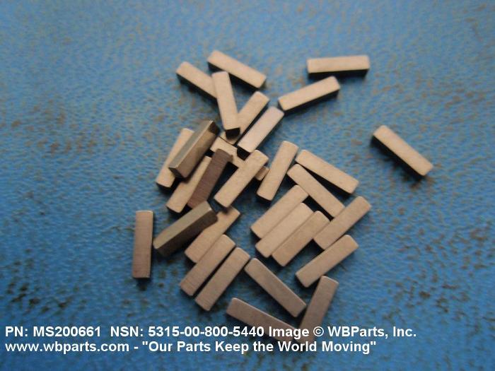 5315-00-800-5440 A metallic item, usually square or rectangular in cross section, usually longer in relation to its width and thickness, with or without a head, usually designed to fit into the pre-cut slots of two adjacent cylindrically shaped members, to prevent relative rotational movement between the two. It may have mounting holes or slots.