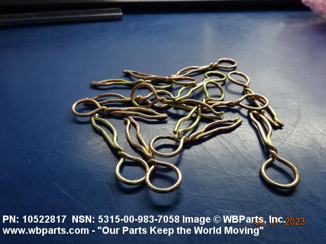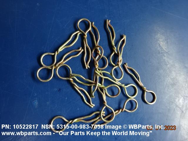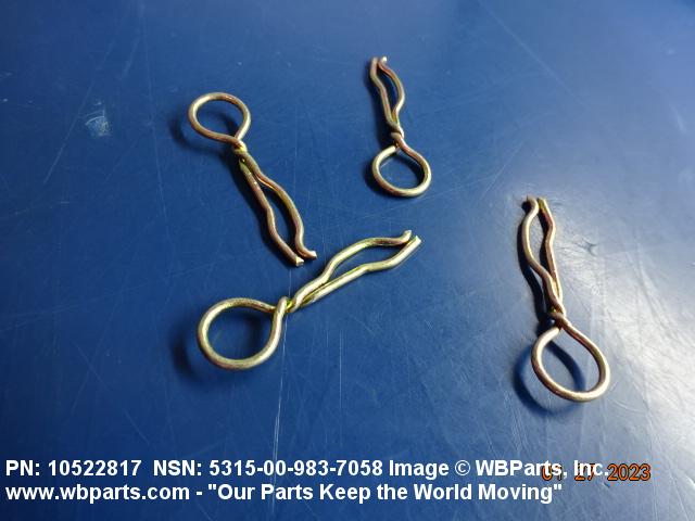 5315-00-983-7058 A fastening device formed from resilient wire stock into a shape resembling the letter "U", of which at least one of the prongs is straight for insertion into a hole; the other prong may have one or more curvatures along its length. It is designed to hold itself in place by its inherent spring action. See also CLIP, RETAINING and RING, RETAINING.