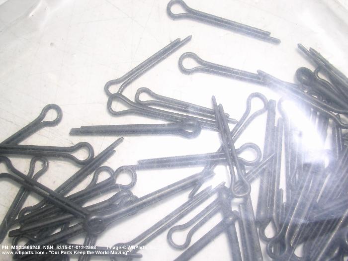 5315-01-012-2568 A half round, cylindrical, or flat piece of metal, bent to form a straight or crimped two-pronged device with an eye at one end, for inserting in a hole drilled at right angle to the axis of the stud, shaft, or like item. Its ends are separable or one end is bent to hold it in place.