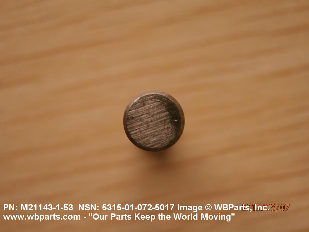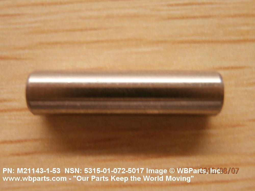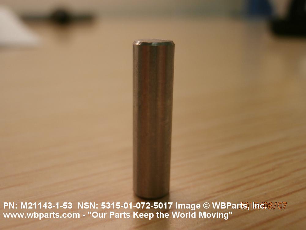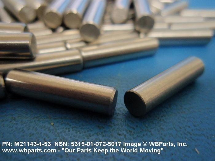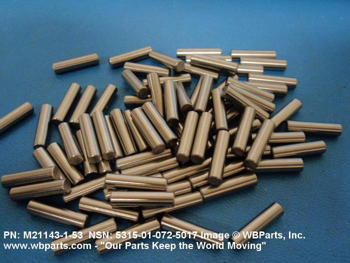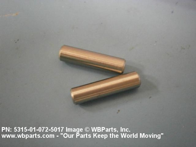 5315-01-072-5017 A headless, cylindrically-shaped item having a straight, smooth, solid body, with or without a drilled hole(s). It has an outside diameter equal to or less than its length. Its length must not exceed twelve inches (304 MM); for items whose length exceeds twelve inches (304 MM); see ROD, STRAIGHT, HEADLESS. It is used for aligning or transfer of torque and/or thrust, by fitting into corresponding holes of another item. See also PIN, STRAIGHT, THREADED.
