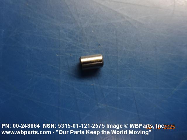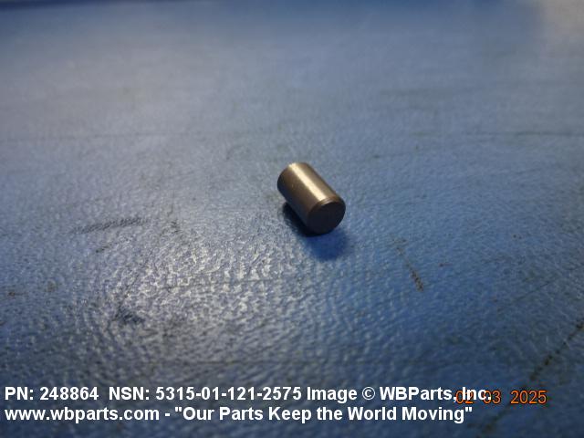 5315-01-121-2575 A headless, cylindrically-shaped item having a straight, smooth, solid body, with or without a drilled hole(s). It has an outside diameter equal to or less than its length. Its length must not exceed twelve inches (304 MM); for items whose length exceeds twelve inches (304 MM); see ROD, STRAIGHT, HEADLESS. It is used for aligning or transfer of torque and/or thrust, by fitting into corresponding holes of another item. See also PIN, STRAIGHT, THREADED.