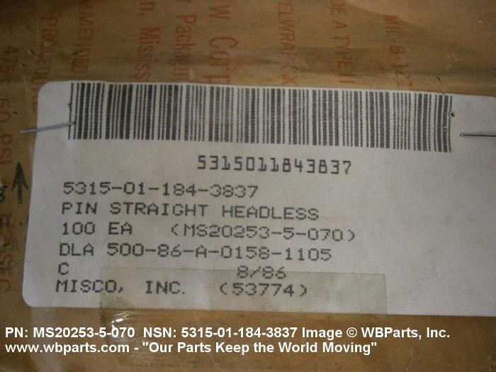 5315-01-184-3837 A headless, cylindrically-shaped item having a straight, smooth, solid body, with or without a drilled hole(s). It has an outside diameter equal to or less than its length. Its length must not exceed twelve inches (304 MM); for items whose length exceeds twelve inches (304 MM); see ROD, STRAIGHT, HEADLESS. It is used for aligning or transfer of torque and/or thrust, by fitting into corresponding holes of another item. See also PIN, STRAIGHT, THREADED.
