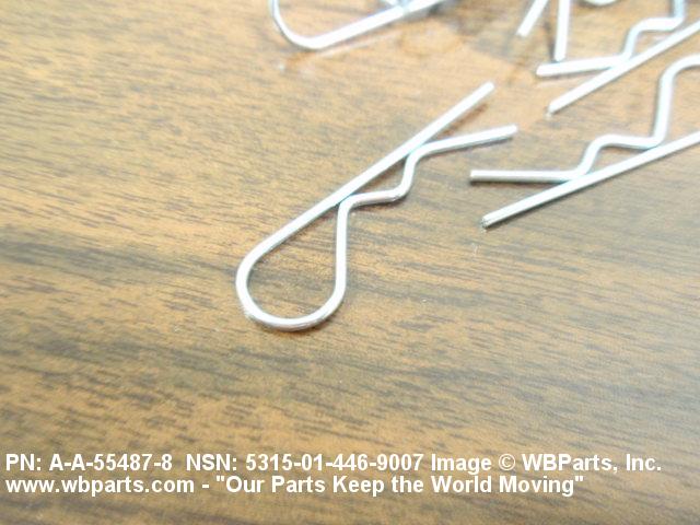 5315-01-446-9007 A fastening device formed from resilient wire stock into a shape resembling the letter "U", of which at least one of the prongs is straight for insertion into a hole; the other prong may have one or more curvatures along its length. It is designed to hold itself in place by its inherent spring action. See also CLIP, RETAINING and RING, RETAINING.
