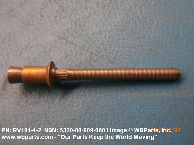 5320-00-009-0601 An item consisting of two or more of the following components: stem, rivet body, sleeve, expander, bolt, and collar. It is a headed fastening device with the shank designed to be expanded by means of a separate or integral stem or mandrel, or bolt and expander. It is designed to be installed or expanded from one side only. Excludes NUT, BLIND ASSEMBLY.