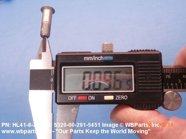 5320-00-291-5451 A metallic or nonmetallic item, headed at one end, with a cylindrically shaped shank which may be tapered, grooved, or threaded. A locking collar or sleeve may be provided to perform the same holding action as the clinching portion of a conventional rivet. The shank may include an external wrenching facility which breaks off at a predetermined applied torque.