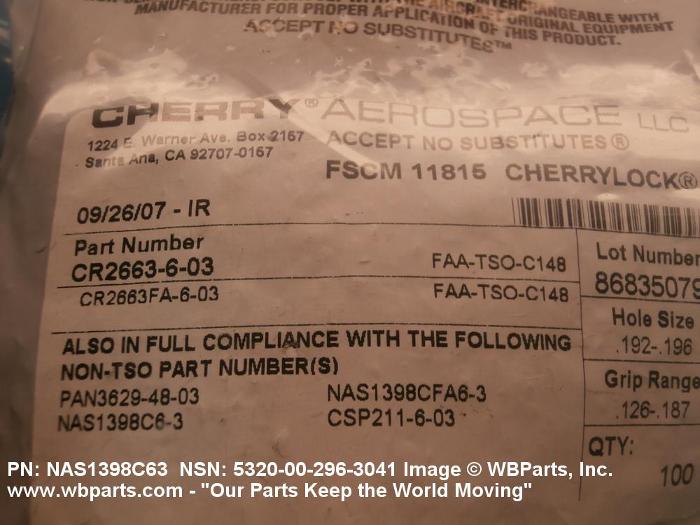 NSN 5320-00-296-3041 NAS1398C63, NAS1398C6-3, NAS1398C6A3