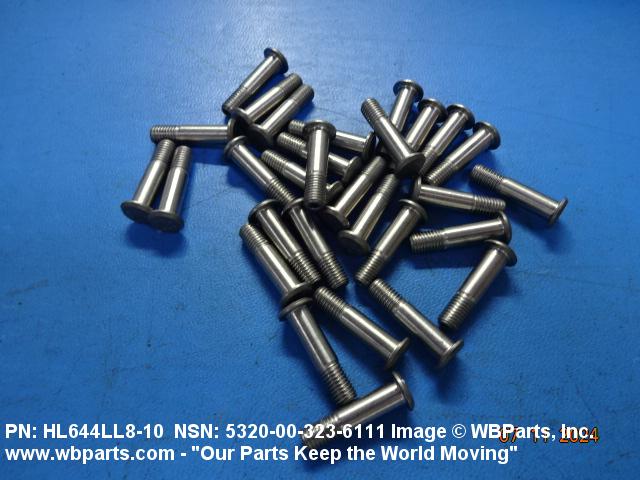 5320-00-323-6111 A metallic or nonmetallic item, headed at one end, with a cylindrically shaped shank which may be tapered, grooved, or threaded. A locking collar or sleeve may be provided to perform the same holding action as the clinching portion of a conventional rivet. The shank may include an external wrenching facility which breaks off at a predetermined applied torque.