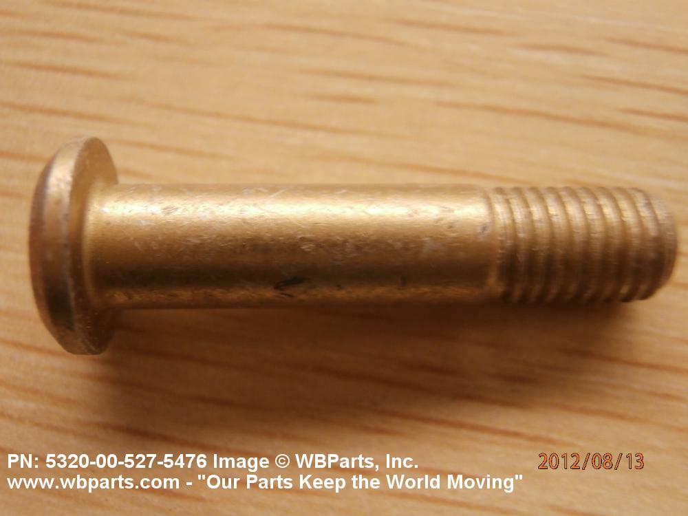 5320-00-527-5476 A metallic or nonmetallic item, headed at one end, with a cylindrically shaped shank which may be tapered, grooved, or threaded. A locking collar or sleeve may be provided to perform the same holding action as the clinching portion of a conventional rivet. The shank may include an external wrenching facility which breaks off at a predetermined applied torque.