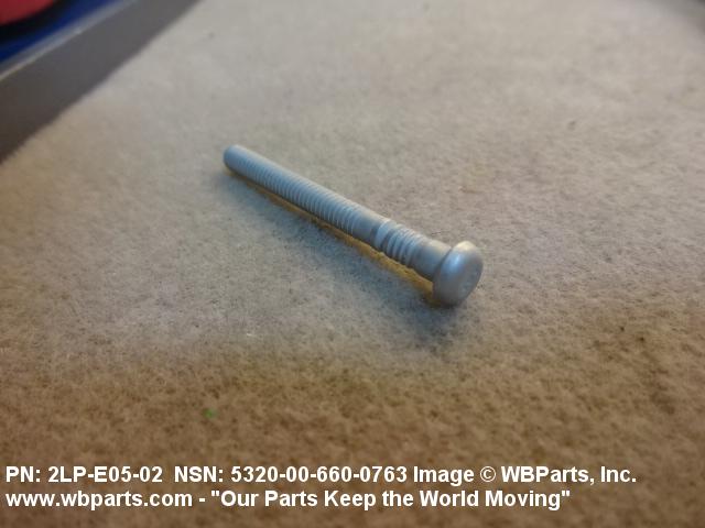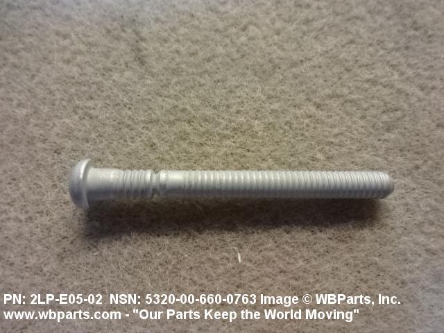 5320-00-660-0763 A metallic or nonmetallic item, headed at one end, with a cylindrically shaped shank which may be tapered, grooved, or threaded. A locking collar or sleeve may be provided to perform the same holding action as the clinching portion of a conventional rivet. The shank may include an external wrenching facility which breaks off at a predetermined applied torque.