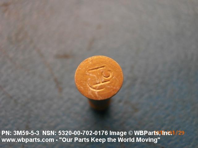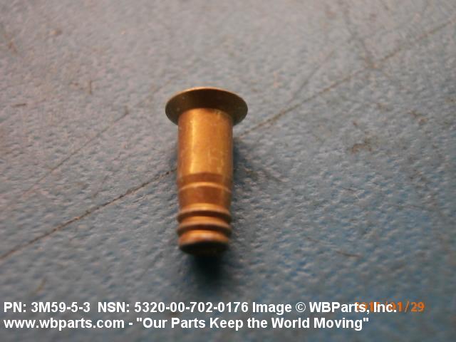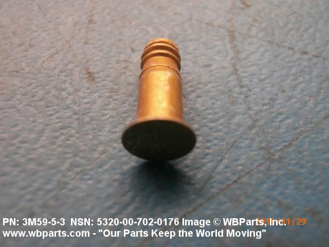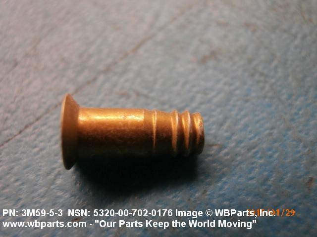 5320-00-702-0176 A metallic or nonmetallic item, headed at one end, with a cylindrically shaped shank which may be tapered, grooved, or threaded. A locking collar or sleeve may be provided to perform the same holding action as the clinching portion of a conventional rivet. The shank may include an external wrenching facility which breaks off at a predetermined applied torque.
