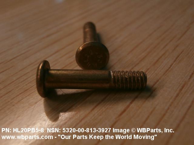 5320-00-813-3927 A metallic or nonmetallic item, headed at one end, with a cylindrically shaped shank which may be tapered, grooved, or threaded. A locking collar or sleeve may be provided to perform the same holding action as the clinching portion of a conventional rivet. The shank may include an external wrenching facility which breaks off at a predetermined applied torque.