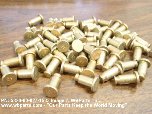 5320-00-827-1533 A metallic or nonmetallic item, headed at one end, with a cylindrically shaped shank which may be tapered, grooved, or threaded. A locking collar or sleeve may be provided to perform the same holding action as the clinching portion of a conventional rivet. The shank may include an external wrenching facility which breaks off at a predetermined applied torque.