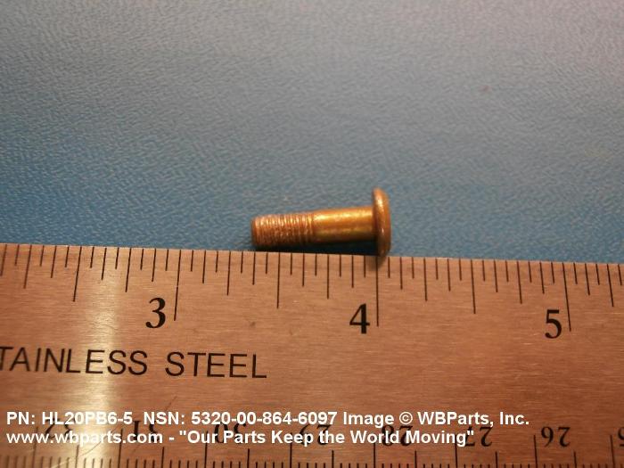 5320-00-864-6097 A metallic or nonmetallic item, headed at one end, with a cylindrically shaped shank which may be tapered, grooved, or threaded. A locking collar or sleeve may be provided to perform the same holding action as the clinching portion of a conventional rivet. The shank may include an external wrenching facility which breaks off at a predetermined applied torque.