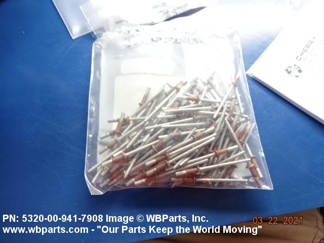 5320-00-941-7908 An item consisting of two or more of the following components: stem, rivet body, sleeve, expander, bolt, and collar. It is a headed fastening device with the shank designed to be expanded by means of a separate or integral stem or mandrel, or bolt and expander. It is designed to be installed or expanded from one side only. Excludes NUT, BLIND ASSEMBLY.