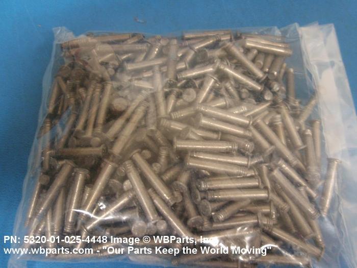 5320-01-025-4448 A metallic or nonmetallic item, headed at one end, with a cylindrically shaped shank which may be tapered, grooved, or threaded. A locking collar or sleeve may be provided to perform the same holding action as the clinching portion of a conventional rivet. The shank may include an external wrenching facility which breaks off at a predetermined applied torque.