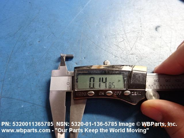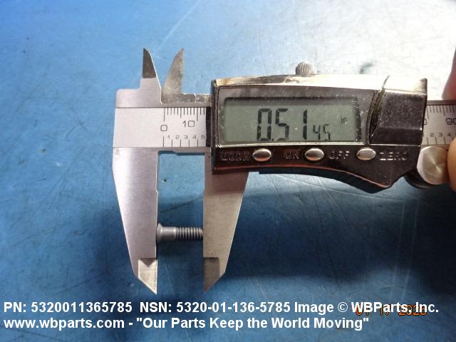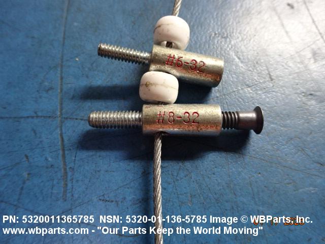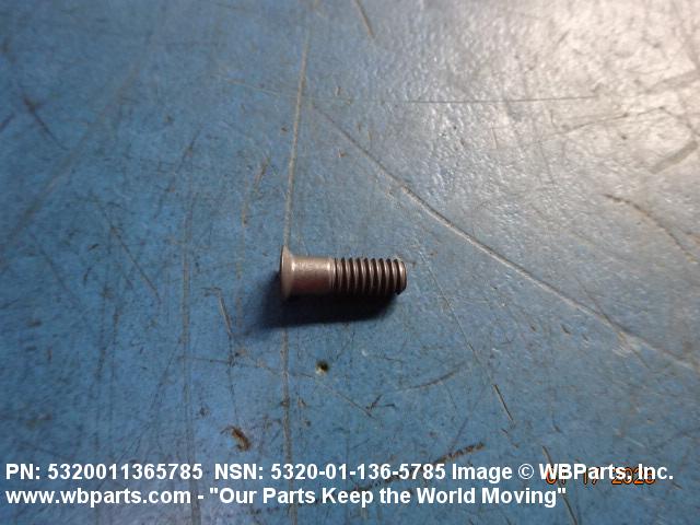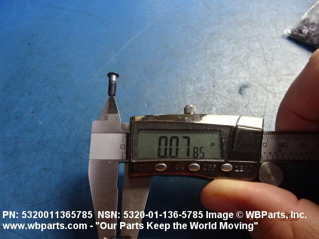 5320-01-136-5785 A metallic or nonmetallic item, headed at one end, with a cylindrically shaped shank which may be tapered, grooved, or threaded. A locking collar or sleeve may be provided to perform the same holding action as the clinching portion of a conventional rivet. The shank may include an external wrenching facility which breaks off at a predetermined applied torque.