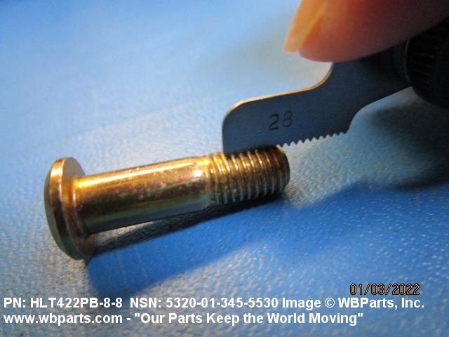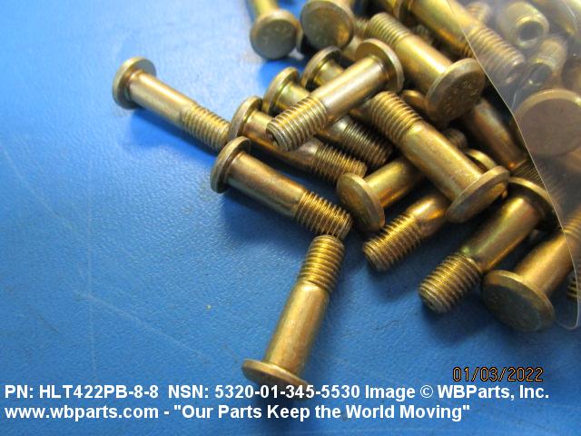 5320-01-345-5530 A metallic or nonmetallic item, headed at one end, with a cylindrically shaped shank which may be tapered, grooved, or threaded. A locking collar or sleeve may be provided to perform the same holding action as the clinching portion of a conventional rivet. The shank may include an external wrenching facility which breaks off at a predetermined applied torque.
