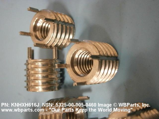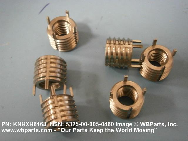 5325-00-005-0460 A cylindrical item which may have wrenching and/or driving facilities and/or shoulders. It is designed to be inserted in a drilled, tapped or a pretapped hole, or molded or pressed into soft material to reduce the size of a tapped hole; to provide threads; to add strength, and/or to prevent stripping. It is one of the following: (1) a one-piece, flanged or unflanged, internally threaded item which may have external threads, and/or serrations around the periphery of the collar, designed to engage a serrated lock ring which is not included with the item; (2) a one-piece precision coiled wire; (3) a two-piece item consisting of an internally threaded cylinder and a mating externally threaded part; or (4) a one-piece internally threaded item whose outside diameter is tapered and/or knurled and/or with fin(s). The internal thread of the item may have a locking feature. Excludes items having a sleeve on on its under portion which can be clinched or crimped. Excludes BUSHING,MACHINE THREAD; NUT,PLAIN,KNURLED; NUT,PLAIN,ROUND; NUT,PLAIN,CLINCH and NUT,SELF-LOCKING,CLINCH. See also NUT,PLAIN,PLATE