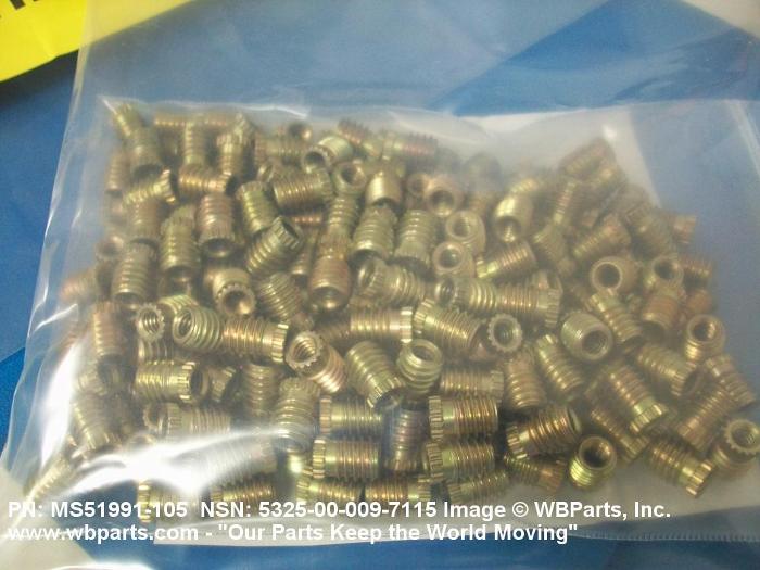 5325-00-009-7115 A cylindrical item which may have wrenching and/or driving facilities and/or shoulders. It is designed to be inserted in a drilled, tapped or a pretapped hole, or molded or pressed into soft material to reduce the size of a tapped hole; to provide threads; to add strength, and/or to prevent stripping. It is one of the following: (1) a one-piece, flanged or unflanged, internally threaded item which may have external threads, and/or serrations around the periphery of the collar, designed to engage a serrated lock ring which is not included with the item; (2) a one-piece precision coiled wire; (3) a two-piece item consisting of an internally threaded cylinder and a mating externally threaded part; or (4) a one-piece internally threaded item whose outside diameter is tapered and/or knurled and/or with fin(s). The internal thread of the item may have a locking feature. Excludes items having a sleeve on on its under portion which can be clinched or crimped. Excludes BUSHING,MACHINE THREAD; NUT,PLAIN,KNURLED; NUT,PLAIN,ROUND; NUT,PLAIN,CLINCH and NUT,SELF-LOCKING,CLINCH. See also NUT,PLAIN,PLATE