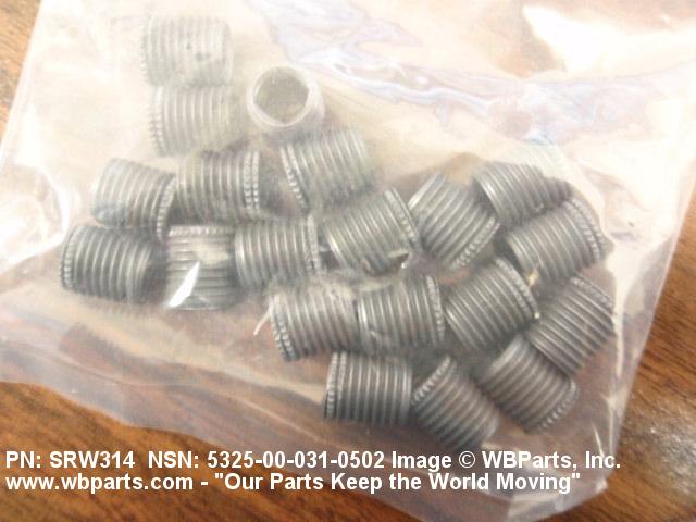 5325-00-031-0502 A cylindrical item which may have wrenching and/or driving facilities and/or shoulders. It is designed to be inserted in a drilled, tapped or a pretapped hole, or molded or pressed into soft material to reduce the size of a tapped hole; to provide threads; to add strength, and/or to prevent stripping. It is one of the following: (1) a one-piece, flanged or unflanged, internally threaded item which may have external threads, and/or serrations around the periphery of the collar, designed to engage a serrated lock ring which is not included with the item; (2) a one-piece precision coiled wire; (3) a two-piece item consisting of an internally threaded cylinder and a mating externally threaded part; or (4) a one-piece internally threaded item whose outside diameter is tapered and/or knurled and/or with fin(s). The internal thread of the item may have a locking feature. Excludes items having a sleeve on on its under portion which can be clinched or crimped. Excludes BUSHING,MACHINE THREAD; NUT,PLAIN,KNURLED; NUT,PLAIN,ROUND; NUT,PLAIN,CLINCH and NUT,SELF-LOCKING,CLINCH. See also NUT,PLAIN,PLATE