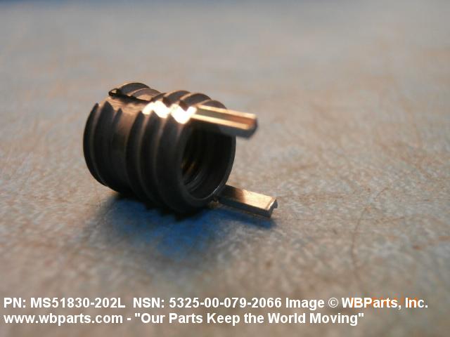 5325-00-079-2066 A cylindrical item which may have wrenching and/or driving facilities and/or shoulders. It is designed to be inserted in a drilled, tapped or a pretapped hole, or molded or pressed into soft material to reduce the size of a tapped hole; to provide threads; to add strength, and/or to prevent stripping. It is one of the following: (1) a one-piece, flanged or unflanged, internally threaded item which may have external threads, and/or serrations around the periphery of the collar, designed to engage a serrated lock ring which is not included with the item; (2) a one-piece precision coiled wire; (3) a two-piece item consisting of an internally threaded cylinder and a mating externally threaded part; or (4) a one-piece internally threaded item whose outside diameter is tapered and/or knurled and/or with fin(s). The internal thread of the item may have a locking feature. Excludes items having a sleeve on on its under portion which can be clinched or crimped. Excludes BUSHING,MACHINE THREAD; NUT,PLAIN,KNURLED; NUT,PLAIN,ROUND; NUT,PLAIN,CLINCH and NUT,SELF-LOCKING,CLINCH. See also NUT,PLAIN,PLATE