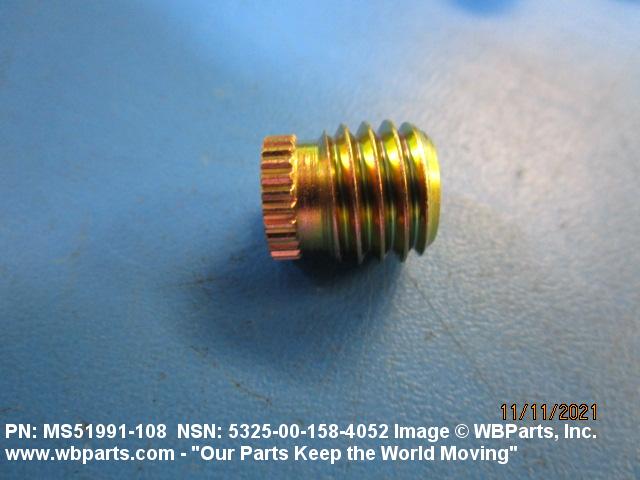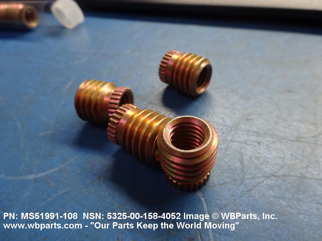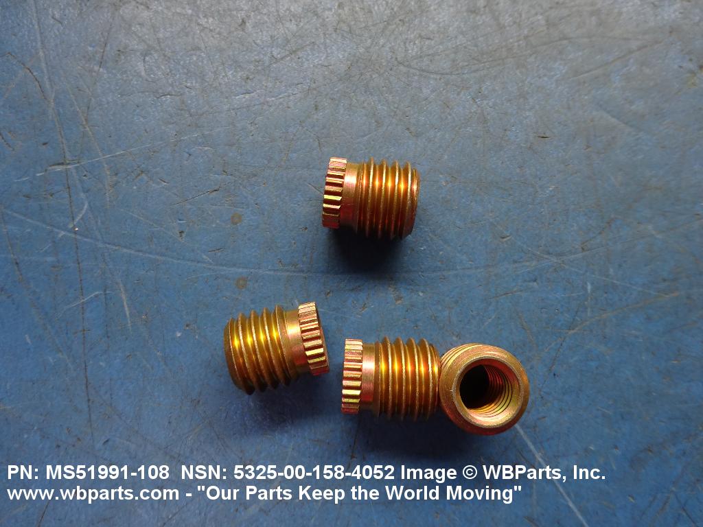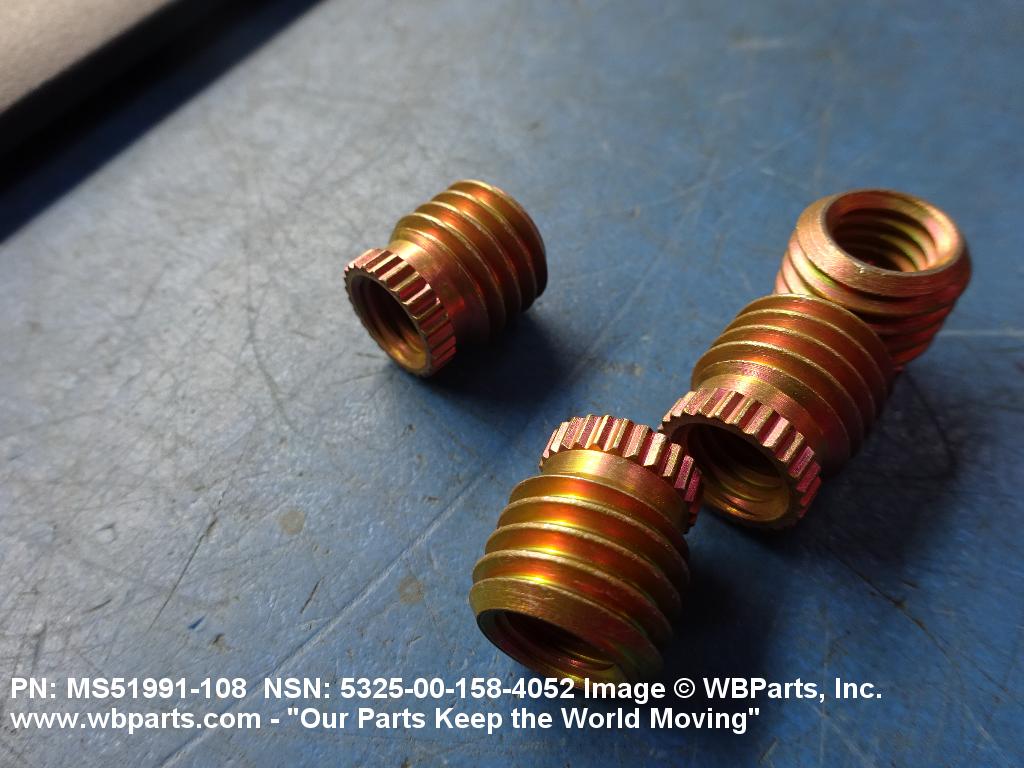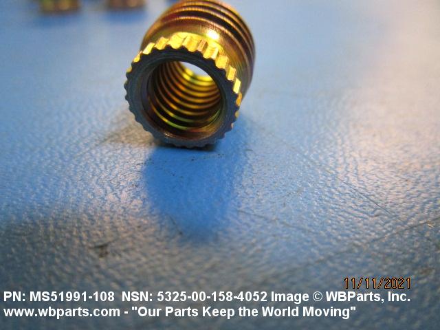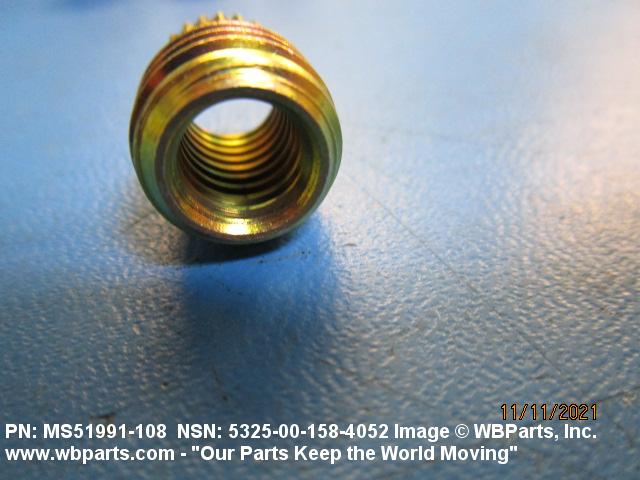 5325-00-158-4052 A cylindrical item which may have wrenching and/or driving facilities and/or shoulders. It is designed to be inserted in a drilled, tapped or a pretapped hole, or molded or pressed into soft material to reduce the size of a tapped hole; to provide threads; to add strength, and/or to prevent stripping. It is one of the following: (1) a one-piece, flanged or unflanged, internally threaded item which may have external threads, and/or serrations around the periphery of the collar, designed to engage a serrated lock ring which is not included with the item; (2) a one-piece precision coiled wire; (3) a two-piece item consisting of an internally threaded cylinder and a mating externally threaded part; or (4) a one-piece internally threaded item whose outside diameter is tapered and/or knurled and/or with fin(s). The internal thread of the item may have a locking feature. Excludes items having a sleeve on on its under portion which can be clinched or crimped. Excludes BUSHING,MACHINE THREAD; NUT,PLAIN,KNURLED; NUT,PLAIN,ROUND; NUT,PLAIN,CLINCH and NUT,SELF-LOCKING,CLINCH. See also NUT,PLAIN,PLATE