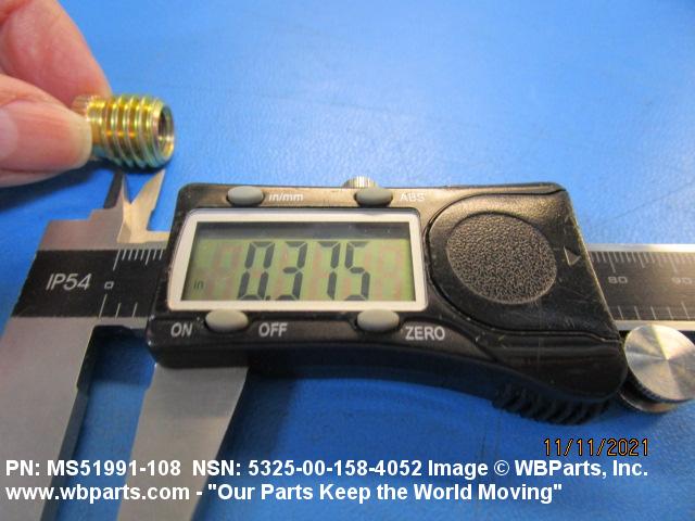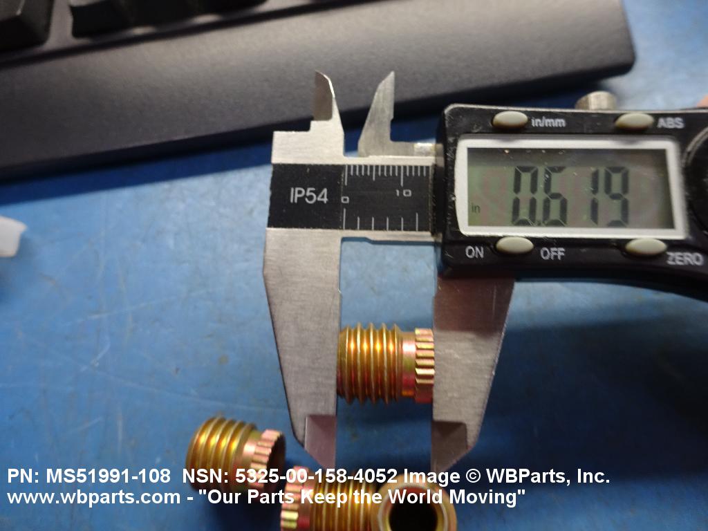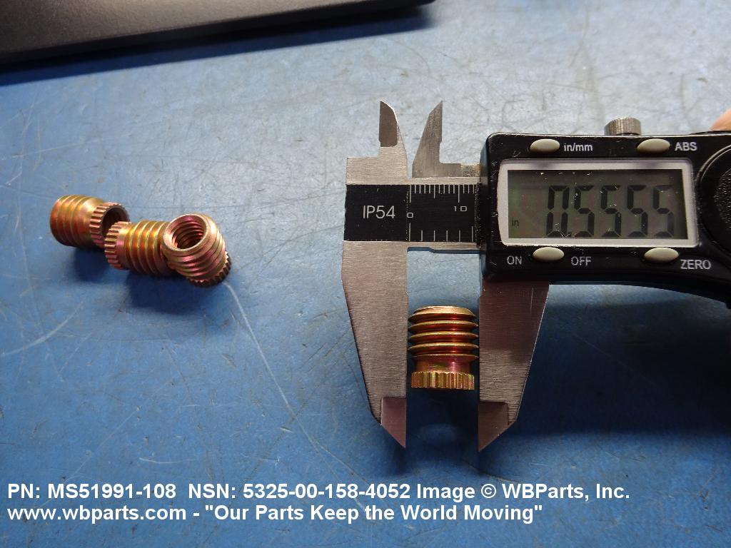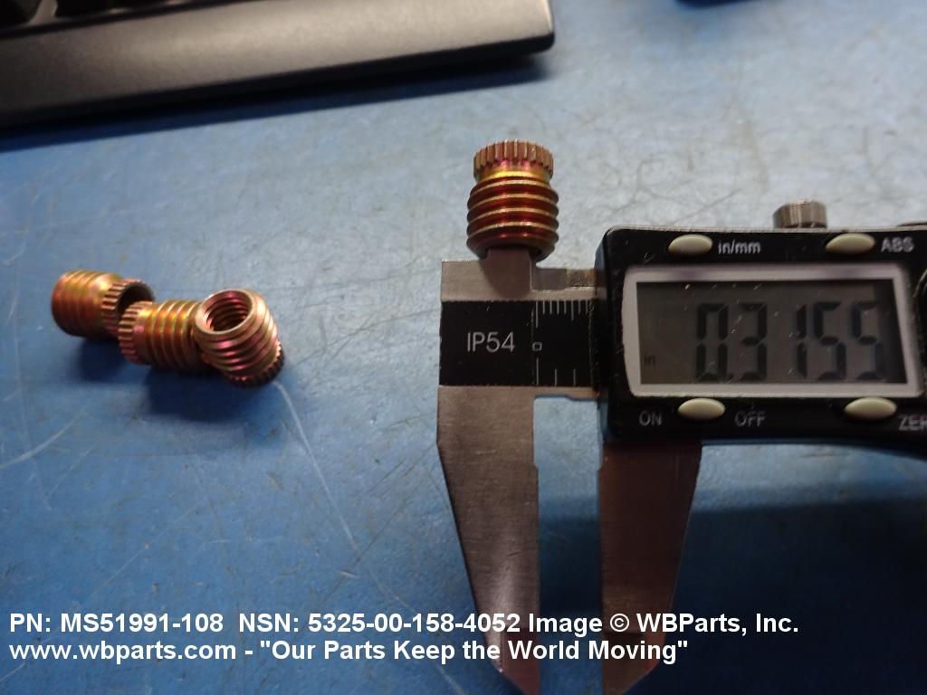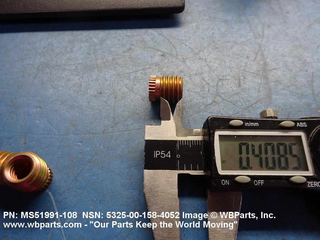 5325-00-158-4052 A cylindrical item which may have wrenching and/or driving facilities and/or shoulders. It is designed to be inserted in a drilled, tapped or a pretapped hole, or molded or pressed into soft material to reduce the size of a tapped hole; to provide threads; to add strength, and/or to prevent stripping. It is one of the following: (1) a one-piece, flanged or unflanged, internally threaded item which may have external threads, and/or serrations around the periphery of the collar, designed to engage a serrated lock ring which is not included with the item; (2) a one-piece precision coiled wire; (3) a two-piece item consisting of an internally threaded cylinder and a mating externally threaded part; or (4) a one-piece internally threaded item whose outside diameter is tapered and/or knurled and/or with fin(s). The internal thread of the item may have a locking feature. Excludes items having a sleeve on on its under portion which can be clinched or crimped. Excludes BUSHING,MACHINE THREAD; NUT,PLAIN,KNURLED; NUT,PLAIN,ROUND; NUT,PLAIN,CLINCH and NUT,SELF-LOCKING,CLINCH. See also NUT,PLAIN,PLATE