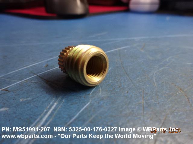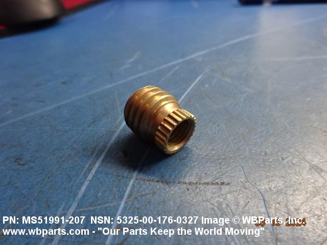 5325-00-176-0327 A cylindrical item which may have wrenching and/or driving facilities and/or shoulders. It is designed to be inserted in a drilled, tapped or a pretapped hole, or molded or pressed into soft material to reduce the size of a tapped hole; to provide threads; to add strength, and/or to prevent stripping. It is one of the following: (1) a one-piece, flanged or unflanged, internally threaded item which may have external threads, and/or serrations around the periphery of the collar, designed to engage a serrated lock ring which is not included with the item; (2) a one-piece precision coiled wire; (3) a two-piece item consisting of an internally threaded cylinder and a mating externally threaded part; or (4) a one-piece internally threaded item whose outside diameter is tapered and/or knurled and/or with fin(s). The internal thread of the item may have a locking feature. Excludes items having a sleeve on on its under portion which can be clinched or crimped. Excludes BUSHING,MACHINE THREAD; NUT,PLAIN,KNURLED; NUT,PLAIN,ROUND; NUT,PLAIN,CLINCH and NUT,SELF-LOCKING,CLINCH. See also NUT,PLAIN,PLATE