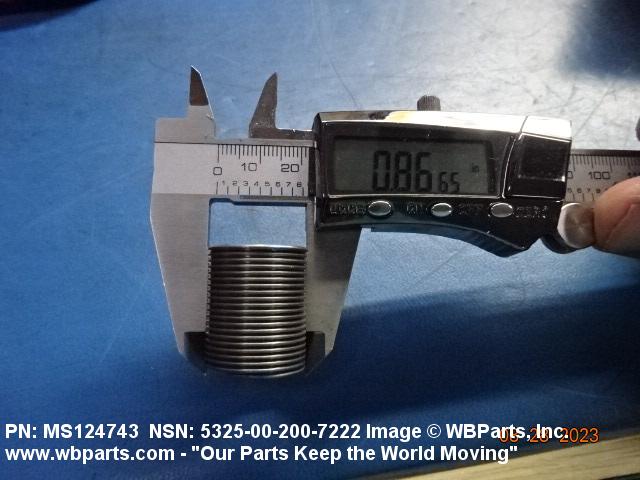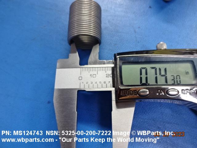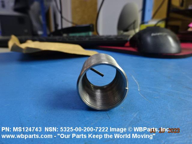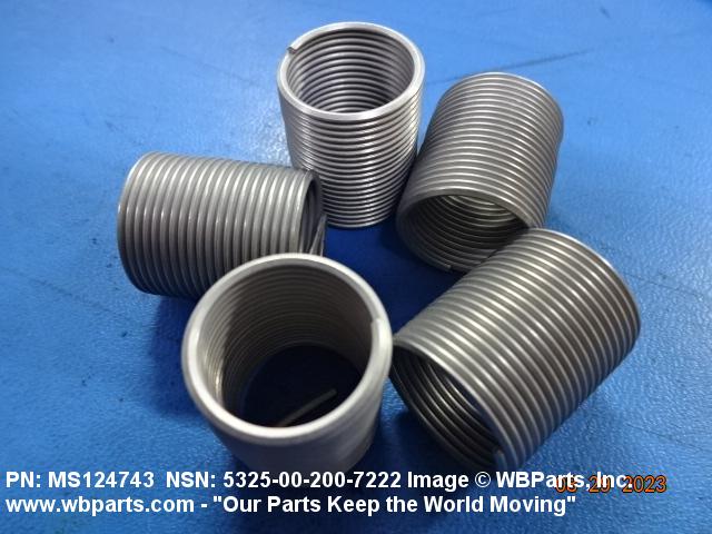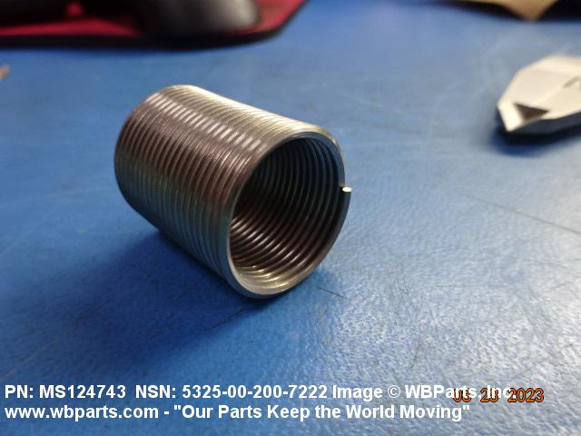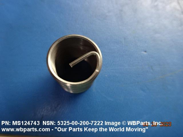 5325-00-200-7222 A cylindrical item which may have wrenching and/or driving facilities and/or shoulders. It is designed to be inserted in a drilled, tapped or a pretapped hole, or molded or pressed into soft material to reduce the size of a tapped hole; to provide threads; to add strength, and/or to prevent stripping. It is one of the following: (1) a one-piece, flanged or unflanged, internally threaded item which may have external threads, and/or serrations around the periphery of the collar, designed to engage a serrated lock ring which is not included with the item; (2) a one-piece precision coiled wire; (3) a two-piece item consisting of an internally threaded cylinder and a mating externally threaded part; or (4) a one-piece internally threaded item whose outside diameter is tapered and/or knurled and/or with fin(s). The internal thread of the item may have a locking feature. Excludes items having a sleeve on on its under portion which can be clinched or crimped. Excludes BUSHING,MACHINE THREAD; NUT,PLAIN,KNURLED; NUT,PLAIN,ROUND; NUT,PLAIN,CLINCH and NUT,SELF-LOCKING,CLINCH. See also NUT,PLAIN,PLATE