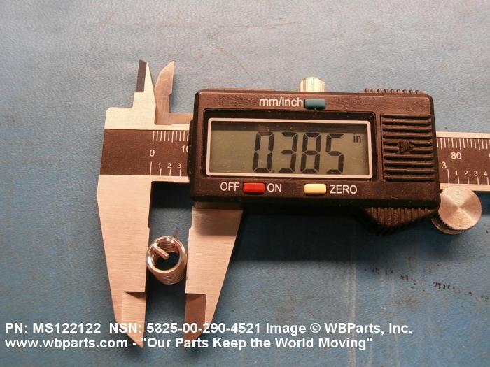 5325-00-290-4521 A cylindrical item which may have wrenching and/or driving facilities and/or shoulders. It is designed to be inserted in a drilled, tapped or a pretapped hole, or molded or pressed into soft material to reduce the size of a tapped hole; to provide threads; to add strength, and/or to prevent stripping. It is one of the following: (1) a one-piece, flanged or unflanged, internally threaded item which may have external threads, and/or serrations around the periphery of the collar, designed to engage a serrated lock ring which is not included with the item; (2) a one-piece precision coiled wire; (3) a two-piece item consisting of an internally threaded cylinder and a mating externally threaded part; or (4) a one-piece internally threaded item whose outside diameter is tapered and/or knurled and/or with fin(s). The internal thread of the item may have a locking feature. Excludes items having a sleeve on on its under portion which can be clinched or crimped. Excludes BUSHING,MACHINE THREAD; NUT,PLAIN,KNURLED; NUT,PLAIN,ROUND; NUT,PLAIN,CLINCH and NUT,SELF-LOCKING,CLINCH. See also NUT,PLAIN,PLATE