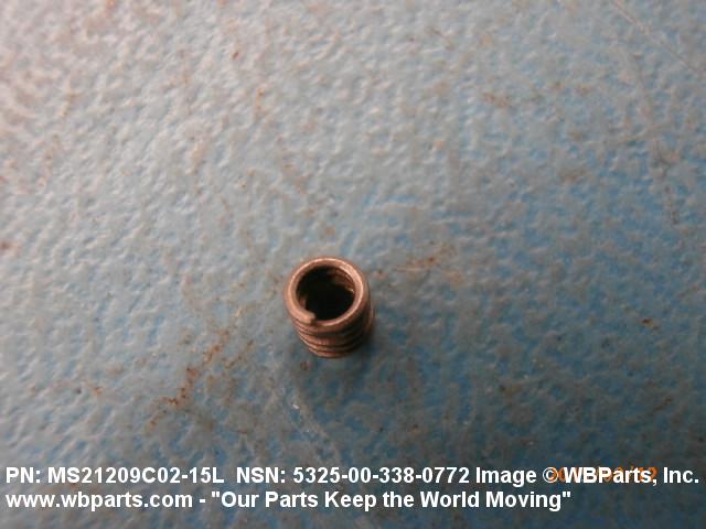 5325-00-338-0772 A cylindrical item which may have wrenching and/or driving facilities and/or shoulders. It is designed to be inserted in a drilled, tapped or a pretapped hole, or molded or pressed into soft material to reduce the size of a tapped hole; to provide threads; to add strength, and/or to prevent stripping. It is one of the following: (1) a one-piece, flanged or unflanged, internally threaded item which may have external threads, and/or serrations around the periphery of the collar, designed to engage a serrated lock ring which is not included with the item; (2) a one-piece precision coiled wire; (3) a two-piece item consisting of an internally threaded cylinder and a mating externally threaded part; or (4) a one-piece internally threaded item whose outside diameter is tapered and/or knurled and/or with fin(s). The internal thread of the item may have a locking feature. Excludes items having a sleeve on on its under portion which can be clinched or crimped. Excludes BUSHING,MACHINE THREAD; NUT,PLAIN,KNURLED; NUT,PLAIN,ROUND; NUT,PLAIN,CLINCH and NUT,SELF-LOCKING,CLINCH. See also NUT,PLAIN,PLATE