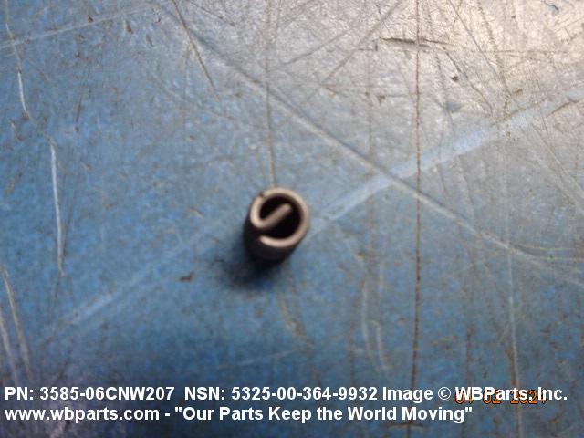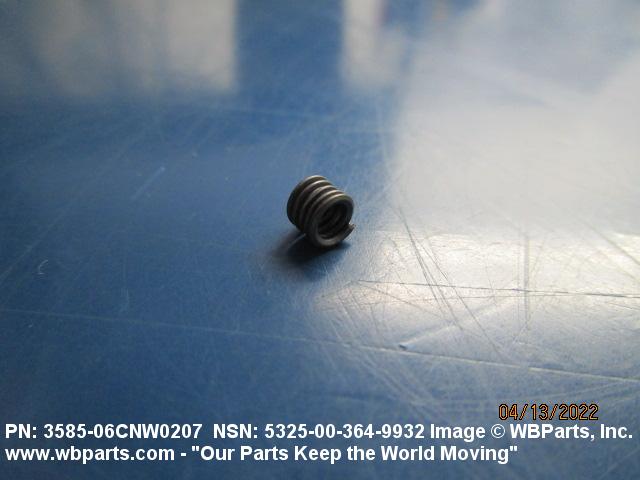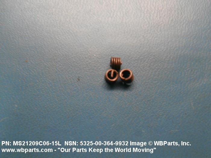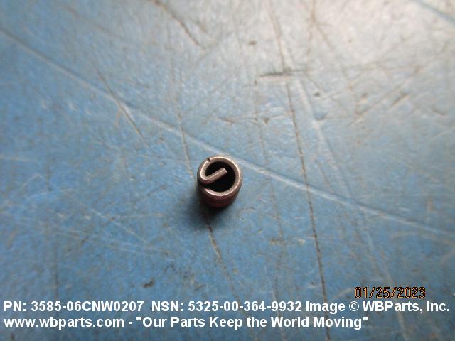 5325-00-364-9932 A cylindrical item which may have wrenching and/or driving facilities and/or shoulders. It is designed to be inserted in a drilled, tapped or a pretapped hole, or molded or pressed into soft material to reduce the size of a tapped hole; to provide threads; to add strength, and/or to prevent stripping. It is one of the following: (1) a one-piece, flanged or unflanged, internally threaded item which may have external threads, and/or serrations around the periphery of the collar, designed to engage a serrated lock ring which is not included with the item; (2) a one-piece precision coiled wire; (3) a two-piece item consisting of an internally threaded cylinder and a mating externally threaded part; or (4) a one-piece internally threaded item whose outside diameter is tapered and/or knurled and/or with fin(s). The internal thread of the item may have a locking feature. Excludes items having a sleeve on on its under portion which can be clinched or crimped. Excludes BUSHING,MACHINE THREAD; NUT,PLAIN,KNURLED; NUT,PLAIN,ROUND; NUT,PLAIN,CLINCH and NUT,SELF-LOCKING,CLINCH. See also NUT,PLAIN,PLATE