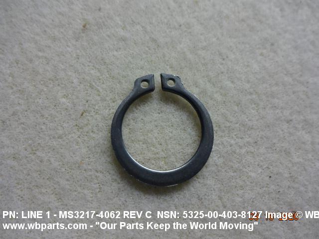 5325-00-403-8127 A resilient metal item, circular or nearly circular, which is designed to be inserted into an internal or external groove and retained by its own spring action, or it may have external prongs or projections designed to be inserted into a hole and retained by spring action of the prongs which grip by imbedding into the material. For items having internal prongs which perform the same function, see PUSH ON NUT. It is used to keep and/or lock a part(s) in position, as a ball bearing on a shaft or in a housing. See also CLIP, RETAINING and PIN, LOCK. Excludes RING, CONNECTING, ROUND.