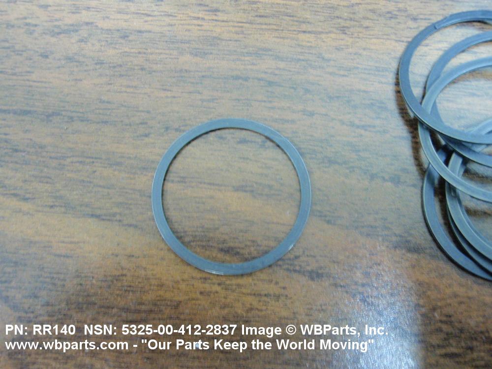 5325-00-412-2837 A resilient metal item, circular or nearly circular, which is designed to be inserted into an internal or external groove and retained by its own spring action, or it may have external prongs or projections designed to be inserted into a hole and retained by spring action of the prongs which grip by imbedding into the material. For items having internal prongs which perform the same function, see PUSH ON NUT. It is used to keep and/or lock a part(s) in position, as a ball bearing on a shaft or in a housing. See also CLIP, RETAINING and PIN, LOCK. Excludes RING, CONNECTING, ROUND.