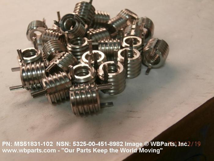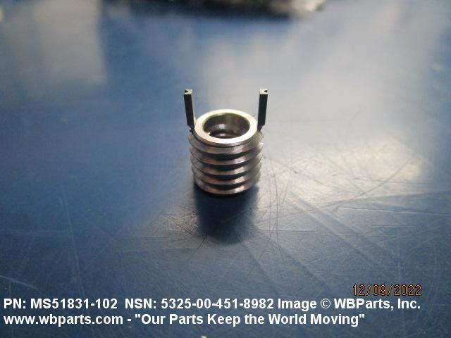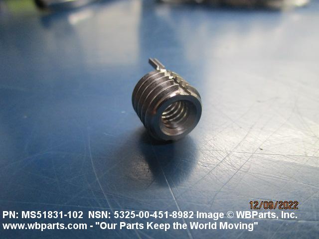 5325-00-451-8982 A cylindrical item which may have wrenching and/or driving facilities and/or shoulders. It is designed to be inserted in a drilled, tapped or a pretapped hole, or molded or pressed into soft material to reduce the size of a tapped hole; to provide threads; to add strength, and/or to prevent stripping. It is one of the following: (1) a one-piece, flanged or unflanged, internally threaded item which may have external threads, and/or serrations around the periphery of the collar, designed to engage a serrated lock ring which is not included with the item; (2) a one-piece precision coiled wire; (3) a two-piece item consisting of an internally threaded cylinder and a mating externally threaded part; or (4) a one-piece internally threaded item whose outside diameter is tapered and/or knurled and/or with fin(s). The internal thread of the item may have a locking feature. Excludes items having a sleeve on on its under portion which can be clinched or crimped. Excludes BUSHING,MACHINE THREAD; NUT,PLAIN,KNURLED; NUT,PLAIN,ROUND; NUT,PLAIN,CLINCH and NUT,SELF-LOCKING,CLINCH. See also NUT,PLAIN,PLATE