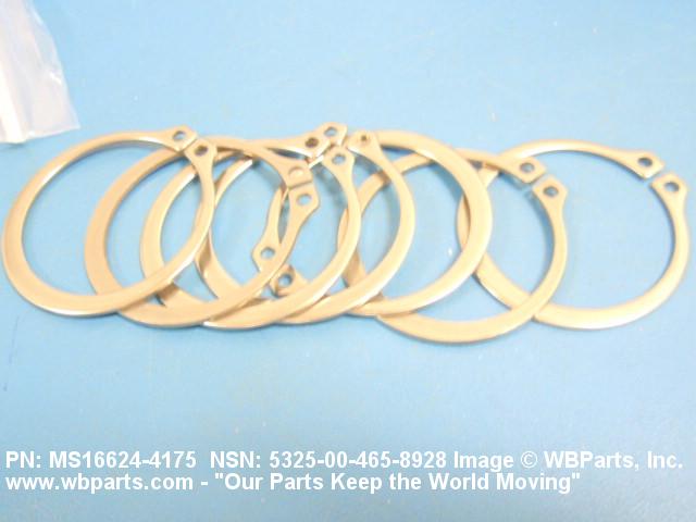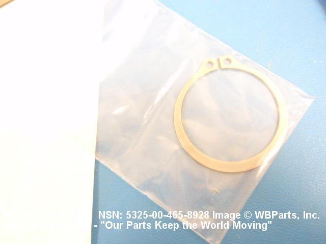 5325-00-465-8928 A resilient metal item, circular or nearly circular, which is designed to be inserted into an internal or external groove and retained by its own spring action, or it may have external prongs or projections designed to be inserted into a hole and retained by spring action of the prongs which grip by imbedding into the material. For items having internal prongs which perform the same function, see PUSH ON NUT. It is used to keep and/or lock a part(s) in position, as a ball bearing on a shaft or in a housing. See also CLIP, RETAINING and PIN, LOCK. Excludes RING, CONNECTING, ROUND.