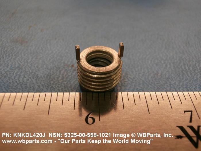 5325-00-558-1021 A cylindrical item which may have wrenching and/or driving facilities and/or shoulders. It is designed to be inserted in a drilled, tapped or a pretapped hole, or molded or pressed into soft material to reduce the size of a tapped hole; to provide threads; to add strength, and/or to prevent stripping. It is one of the following: (1) a one-piece, flanged or unflanged, internally threaded item which may have external threads, and/or serrations around the periphery of the collar, designed to engage a serrated lock ring which is not included with the item; (2) a one-piece precision coiled wire; (3) a two-piece item consisting of an internally threaded cylinder and a mating externally threaded part; or (4) a one-piece internally threaded item whose outside diameter is tapered and/or knurled and/or with fin(s). The internal thread of the item may have a locking feature. Excludes items having a sleeve on on its under portion which can be clinched or crimped. Excludes BUSHING,MACHINE THREAD; NUT,PLAIN,KNURLED; NUT,PLAIN,ROUND; NUT,PLAIN,CLINCH and NUT,SELF-LOCKING,CLINCH. See also NUT,PLAIN,PLATE