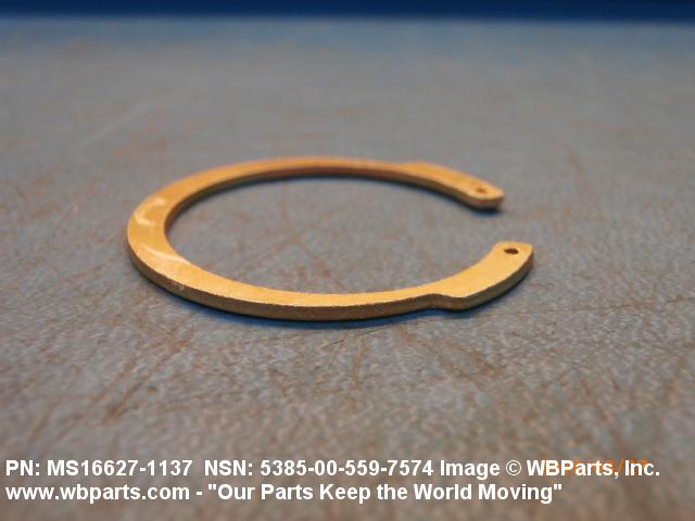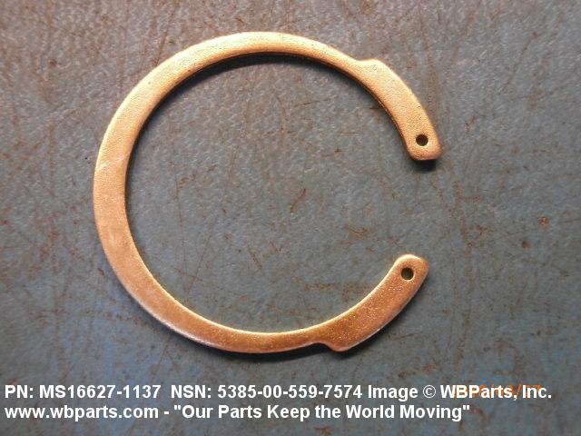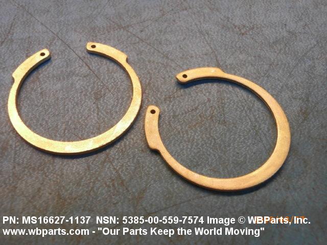 5325-00-559-7574 A resilient metal item, circular or nearly circular, which is designed to be inserted into an internal or external groove and retained by its own spring action, or it may have external prongs or projections designed to be inserted into a hole and retained by spring action of the prongs which grip by imbedding into the material. For items having internal prongs which perform the same function, see PUSH ON NUT. It is used to keep and/or lock a part(s) in position, as a ball bearing on a shaft or in a housing. See also CLIP, RETAINING and PIN, LOCK. Excludes RING, CONNECTING, ROUND.
