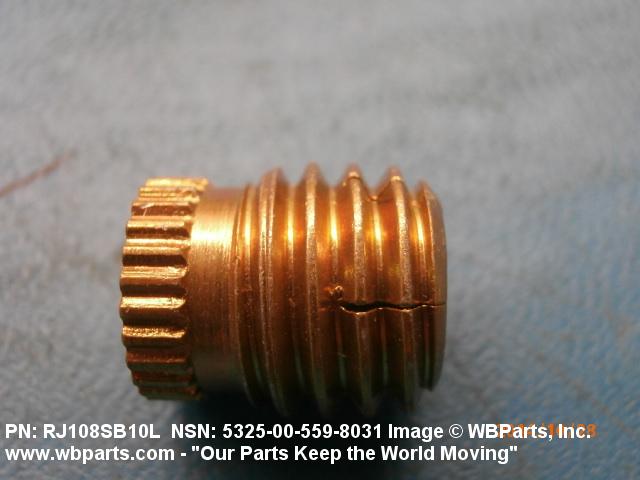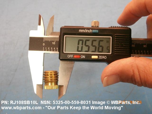 5325-00-559-8031 A cylindrical item which may have wrenching and/or driving facilities and/or shoulders. It is designed to be inserted in a drilled, tapped or a pretapped hole, or molded or pressed into soft material to reduce the size of a tapped hole; to provide threads; to add strength, and/or to prevent stripping. It is one of the following: (1) a one-piece, flanged or unflanged, internally threaded item which may have external threads, and/or serrations around the periphery of the collar, designed to engage a serrated lock ring which is not included with the item; (2) a one-piece precision coiled wire; (3) a two-piece item consisting of an internally threaded cylinder and a mating externally threaded part; or (4) a one-piece internally threaded item whose outside diameter is tapered and/or knurled and/or with fin(s). The internal thread of the item may have a locking feature. Excludes items having a sleeve on on its under portion which can be clinched or crimped. Excludes BUSHING,MACHINE THREAD; NUT,PLAIN,KNURLED; NUT,PLAIN,ROUND; NUT,PLAIN,CLINCH and NUT,SELF-LOCKING,CLINCH. See also NUT,PLAIN,PLATE